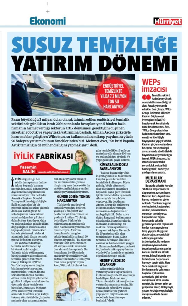 Pazar büyüklüğü 2 milyar dolar olarak tahmin edilen endüstriyel temizlik sektöründe günlük su israfı 20 bin tonlarda hesaplanıyor. 5 binden fazla firmanın hizmet verdiği sektörün artık dönüşmesi gerektiğini düşünen şirketler, robotik ve yapay zekâ yatırımına başladı. Alman Arcora şirketiyle hazır moblar geliştiren Wilco’nun, su kullanmadan mikrop yayılımını yüzde 90 önleyen yatırımı bunun örneklerinden biri. Mehmet Avcı, “Su krizi kapıda. Artık temizliğin de mühendisliğini yapmak şart” dedi.